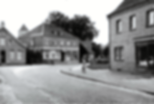 Wir sind hier auf der Großen Straße in Richtung auf die Innenstadt. Auf der linken Seite zweigt die Mühlenstraße ab und wir sehen dort an der Straßenecke einen Teil des Wohnhauses des Schmiedes Hackling. Rechts daneben befindet sich das zweigeschossige Geschäftshaus Pigge, in dem sich heute eine Fahrschule und eine Pizzaria befindet. Auf der recten Bildseite ist ein Teil des Geschäftshauses vom Fleischermeister Bernhard Kamphues zu erkennen. Es ist heute im Besitz des TuS Aschendorf (Rösinghaus) und bietet vielen Bedürftigen preiswerten Wohnraum.